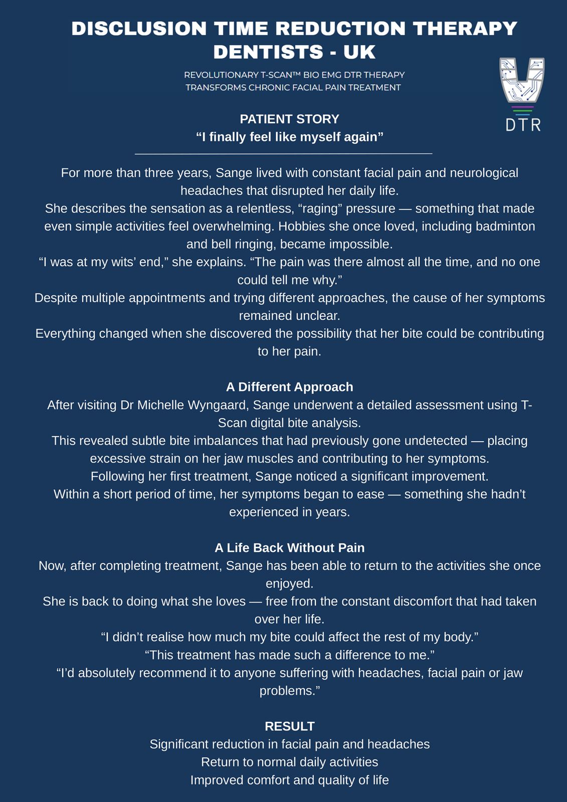 Michelle Wyngaard is one of only six UK dentists to hold the prestigious DTR Certification from the USA. This advanced qualification enables her to treat chronic headaches, migraines, TMD/TMJ symptoms, and neurophysiological facial pain by precisely measuring and correcting muscle hyperactivity — issues that conventional dentistry often cannot detect.